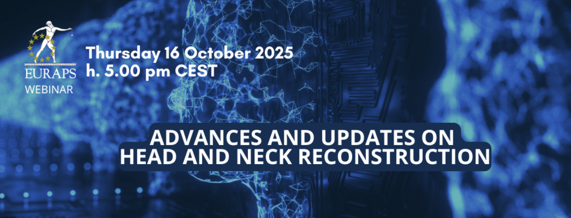 Home EventsEURAPS Webinars: Advances and Updates on Head and Neck Reconstruction EURAPS Webinars: Advances and Updates on Head and Neck Reconstruction Download Event to Calendar Event EURAPS Webinars: Advances and Updates on Head and Neck Reconstruction Thursday 16th October 2025 at 16:00 UK Speakers: Chair: Kalliroi Tzafetta and Jan J. Vranckx Faculty: Ed Chang, JongWoo Choi, Martin Halle, Michael Klebuc, Andres Rodriquez Book online for this event ← Other events Events